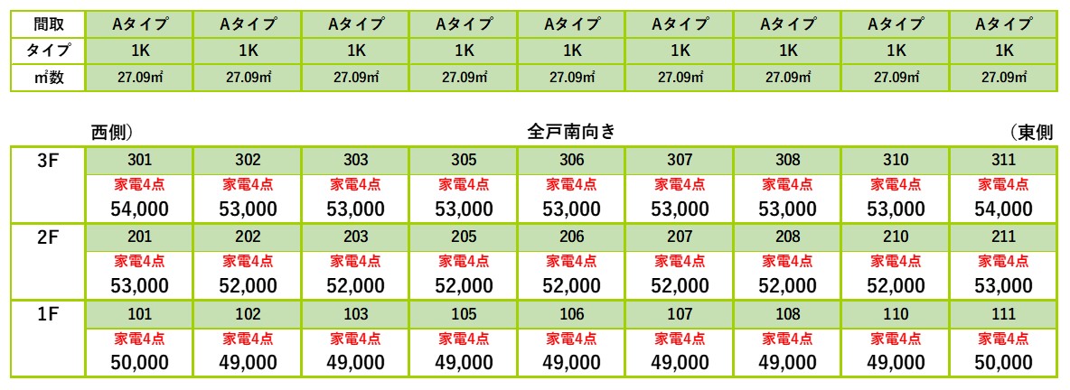 お部屋の間取は、1Kで全同タイプ。居室は8帖以上の広さを確保し、全部屋に居室照明、2口ガスコンロ付き。室内設備も充実しています。