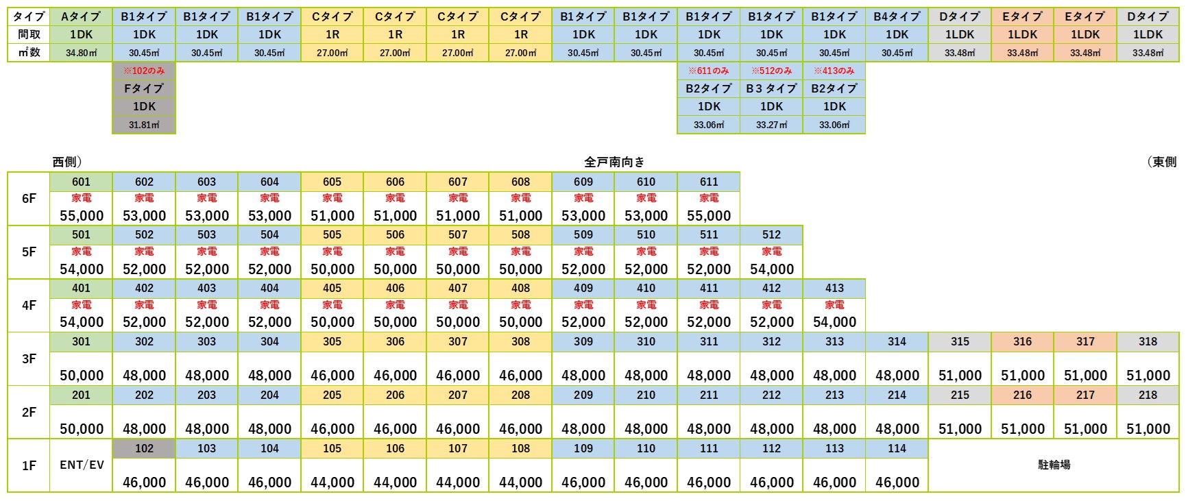 上記家賃表は、2025年10月以降の募集賃料及び家電対象部屋です。募集賃料及び家電対象部屋は変更となる可能性がございます。予めご了承下さい。