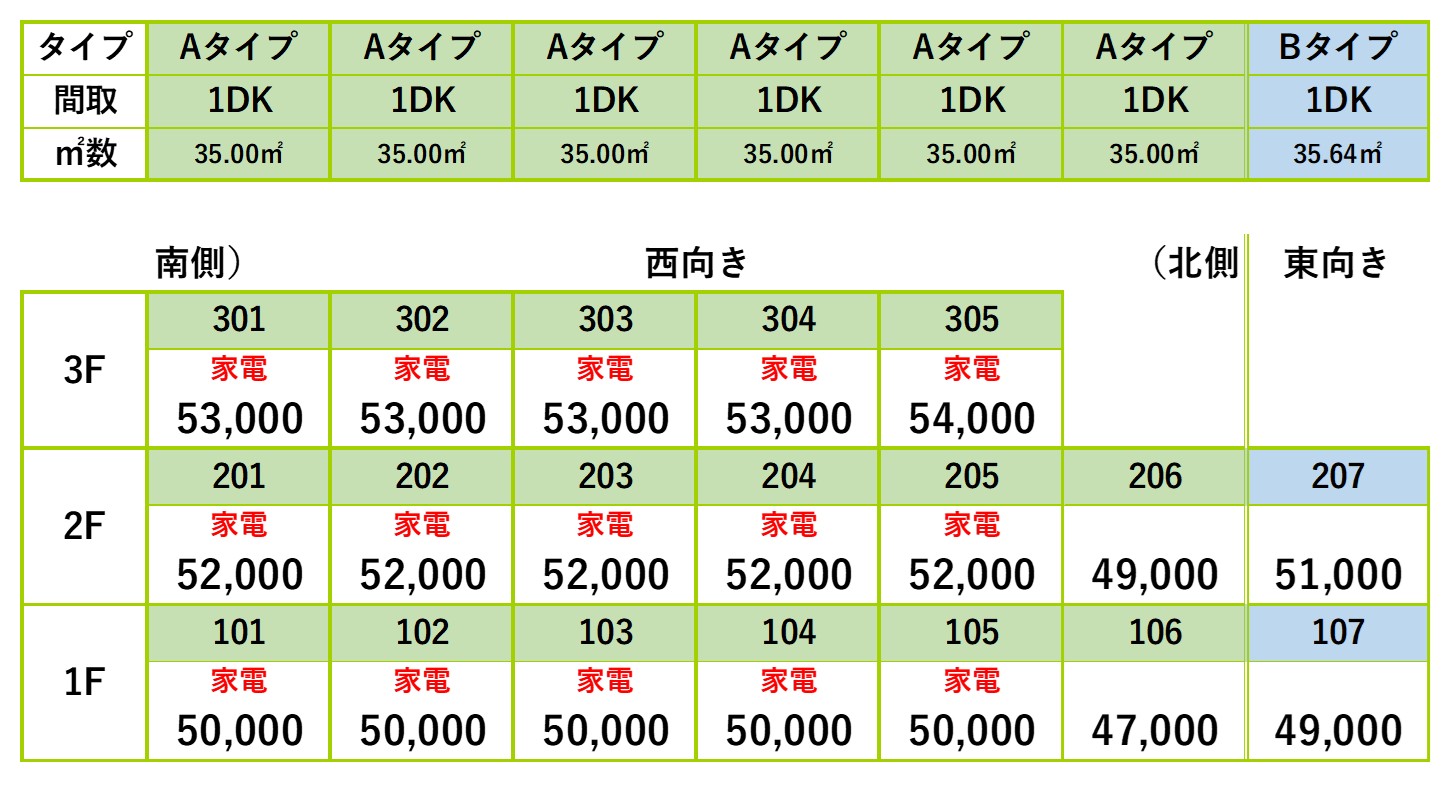 お部屋の間取は、1DKで2タイプ。どちらもキッチンスペース、居室スペースを広く確保した間取です。東向きのタイプは、左右隣戸が無い造りとなっています。