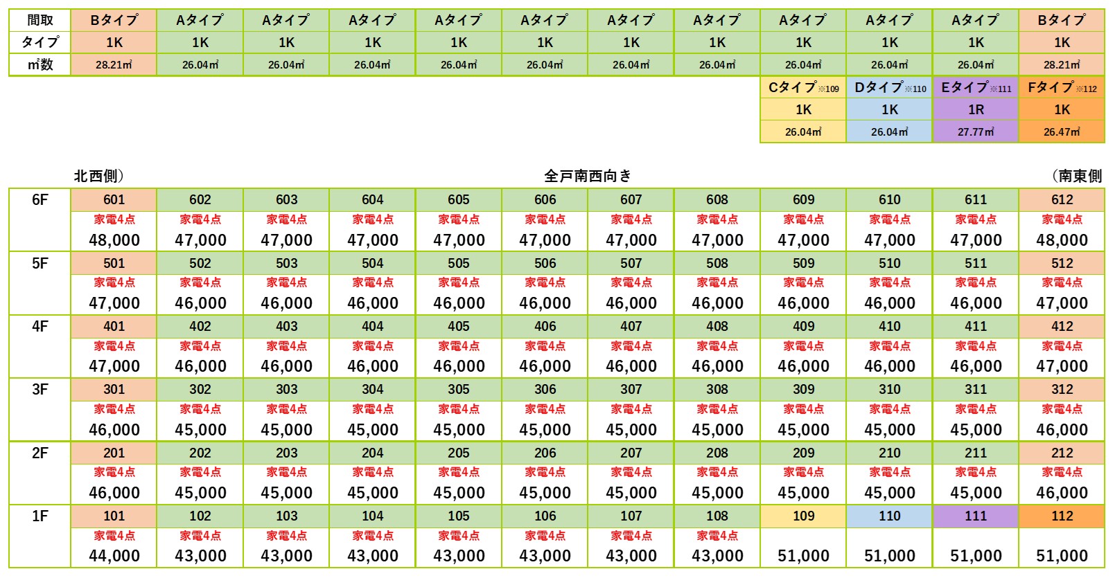 109~112号を除いた居室は家電4点(冷蔵庫・洗濯機・電子レンジ・居室照明)が付きます。