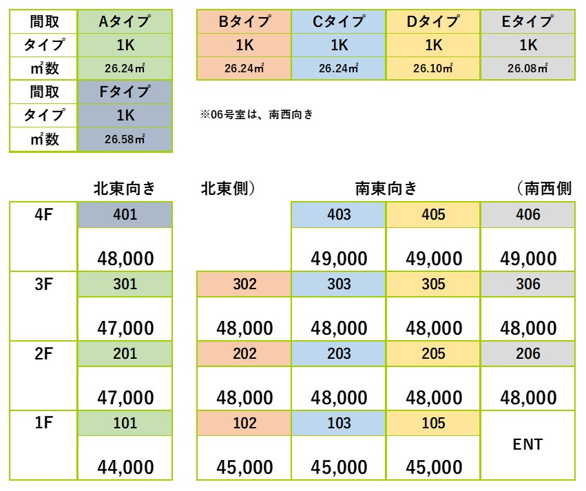 お部屋の間取は、1Kで全6タイプ。居室は8.6帖以上の広さを確保し、グリル付2口ガスコンロや居室照明付きで設備も充実しています。