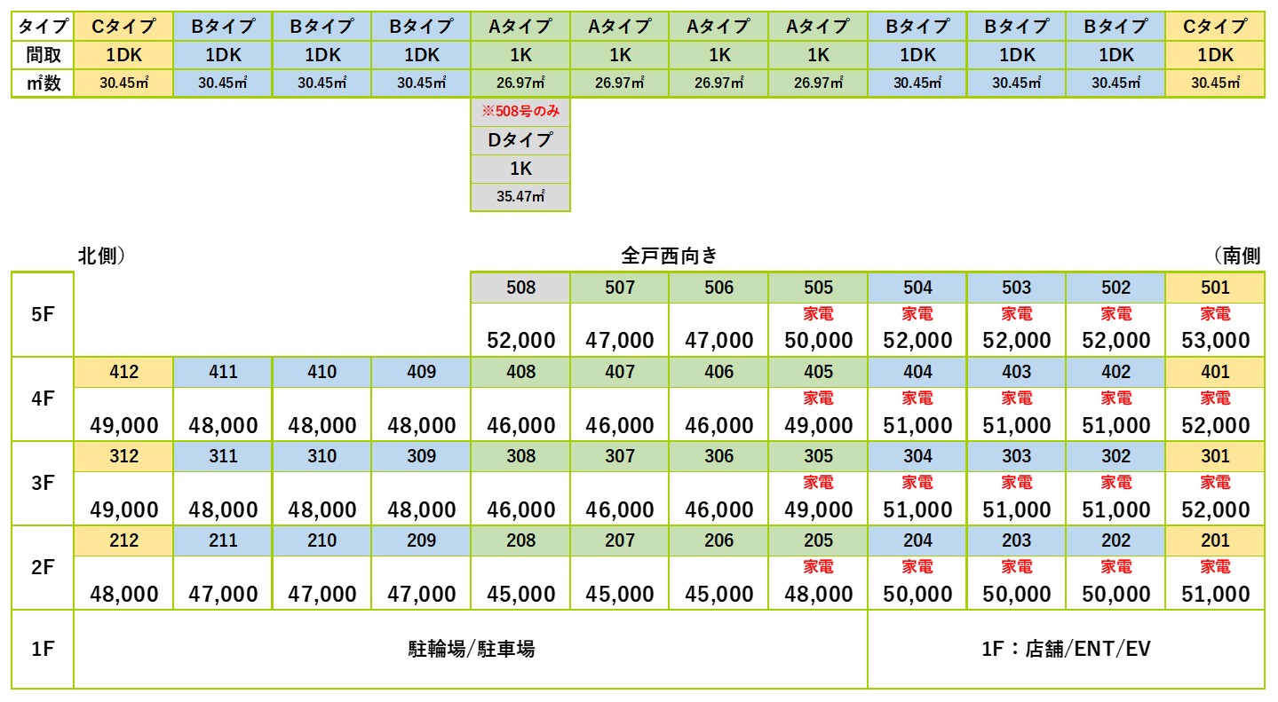 全戸西向き。バルコニーを遮る建物もありません。建物1階には、お寿司屋「亀八」があり、住居は2階以上です。オートロック、宅配ボックス、防犯カメラ、管理会社呼出機能もあり、学生専用ならではの安心安全を配慮した建物設備が充実しています。