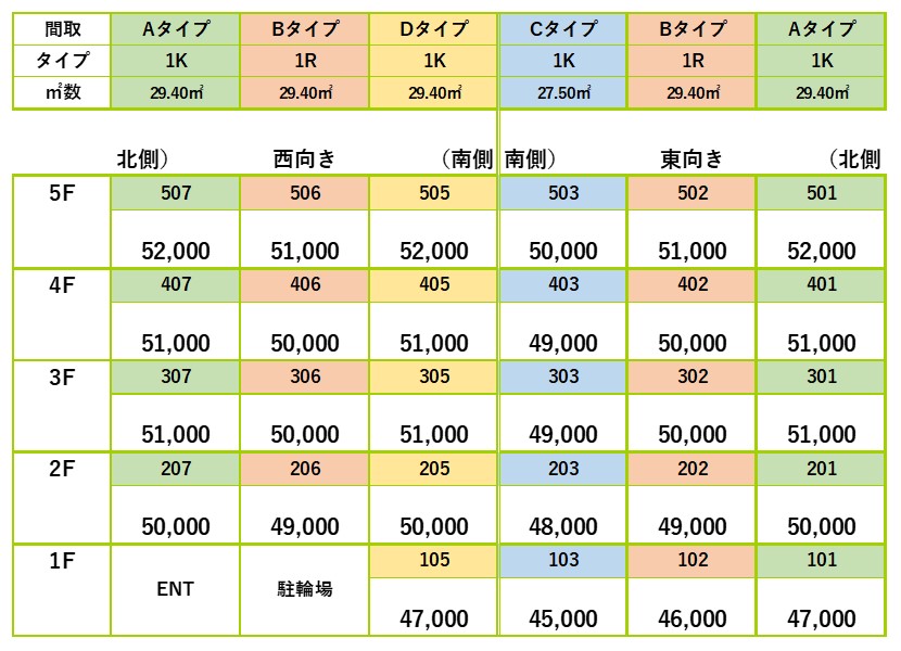 中廊下の造りで、東向きと西向きになります。オートロック、エレベーター、宅配ボックス、防犯カメラ、管理会社呼出機能もあり、学生専用ならではの安心安全を配慮した建物設備が充実しています。