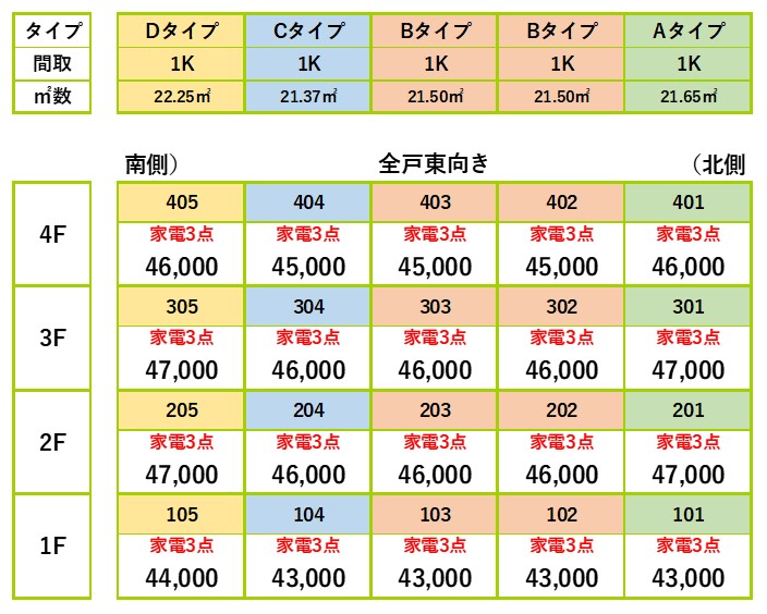 お部屋の間取は、1Kで全4タイプ。一人暮らしに丁度良い広さを取り入れ、全居室に家電3点(冷蔵庫・洗濯機・電子レンジ)付で設備も充実しています。